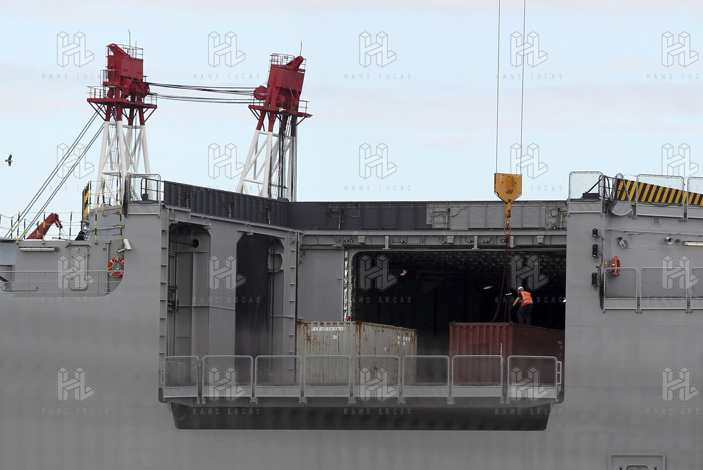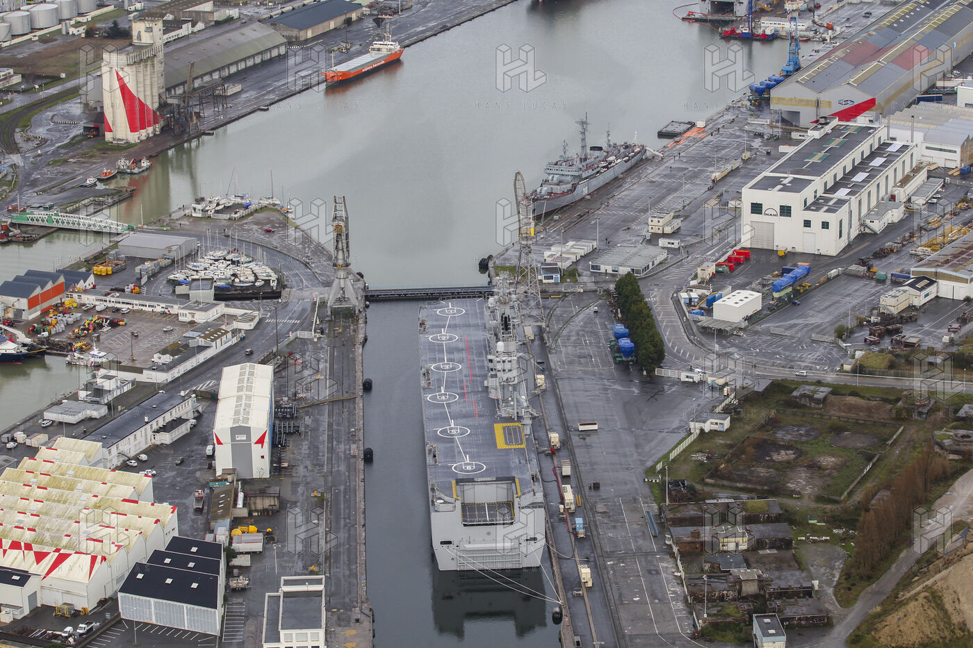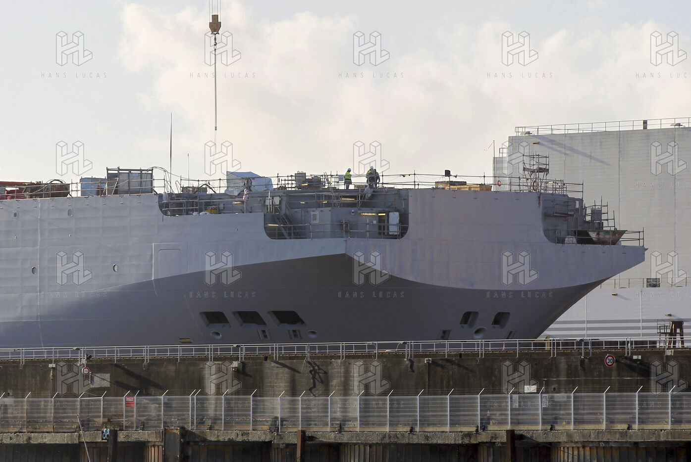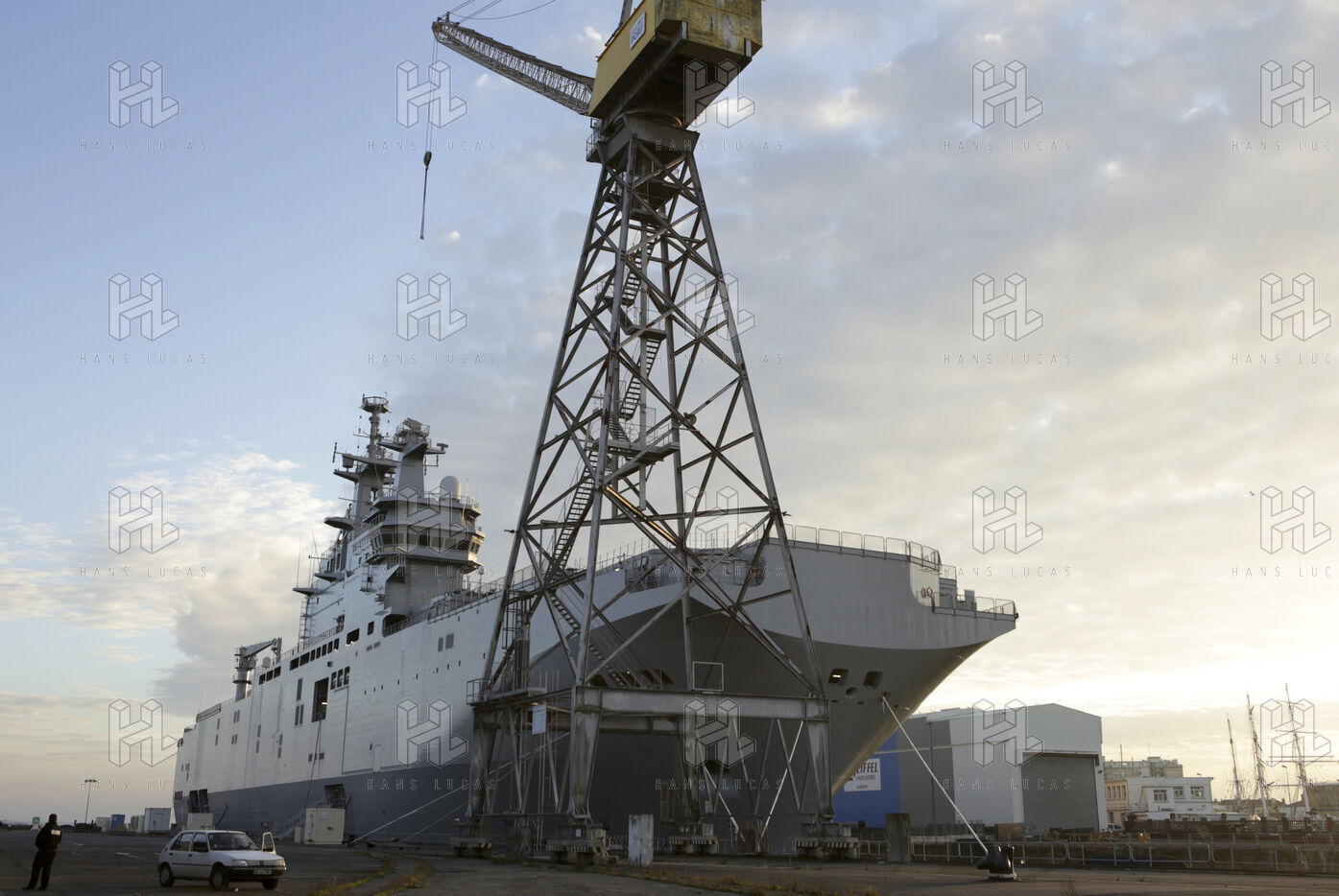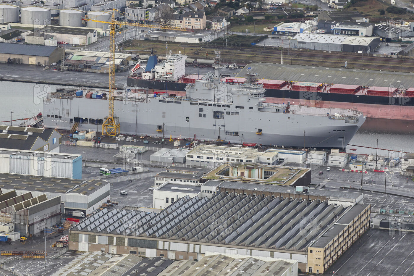 Le navire de guerre Vladivostok, porte-helicopteres de classe Mistral commande par la Russie, est a quai dans les chantiers navals STX France a Saint-Nazaire.