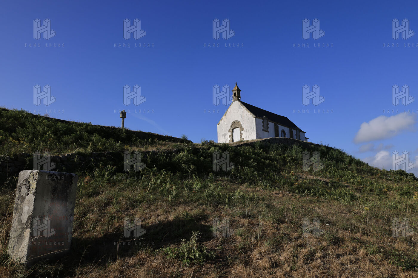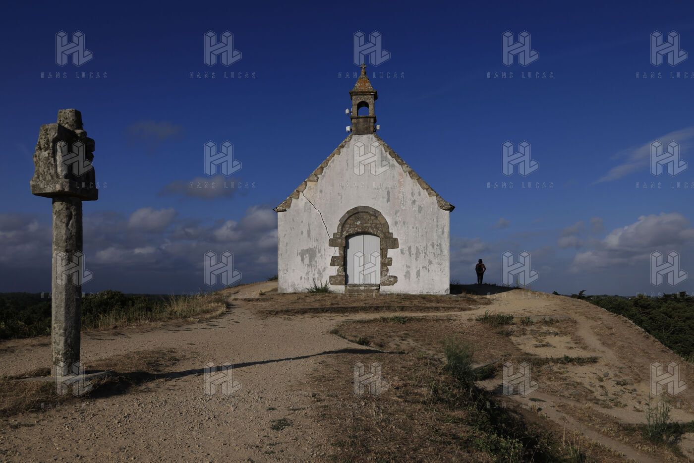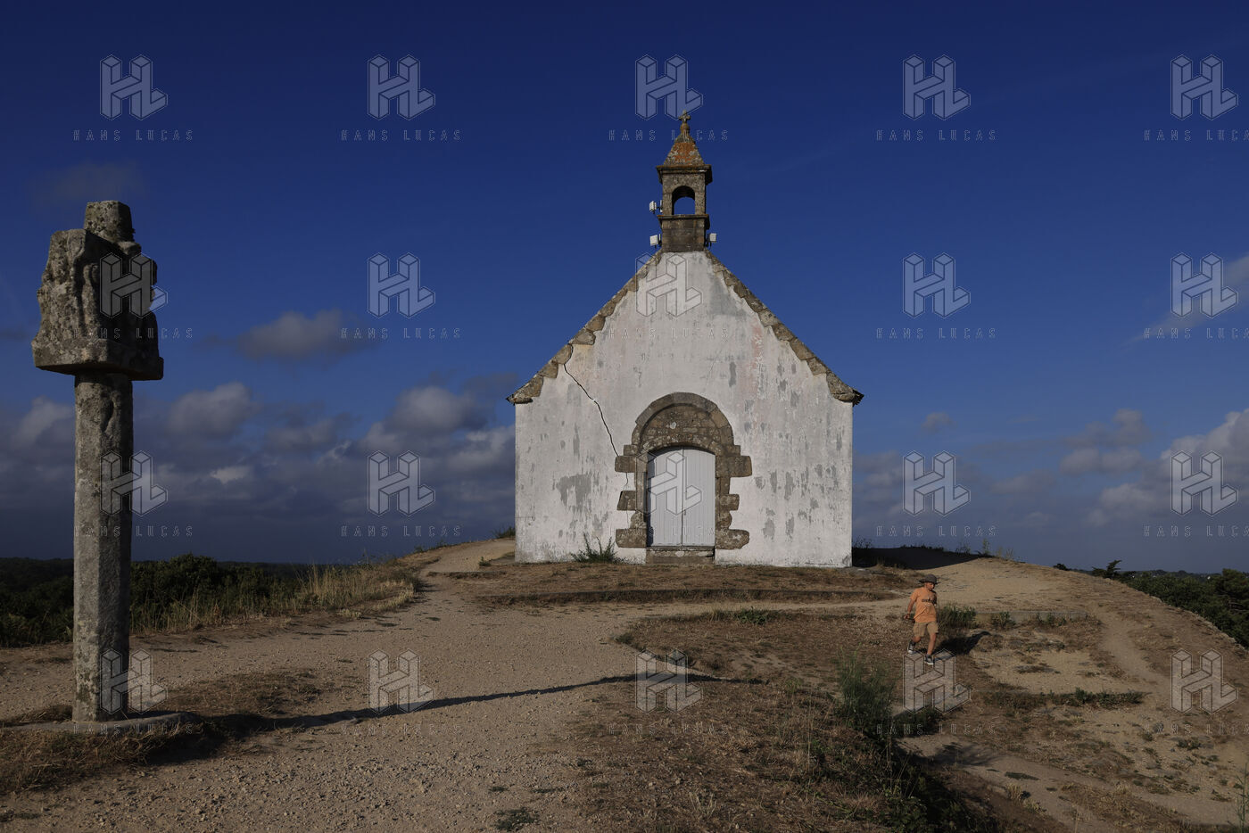 Des touristes visite le site de la chapelle au sommet du tumulus Saint Michel, site classe monument historique. Carnac le 15 juillet 2025.