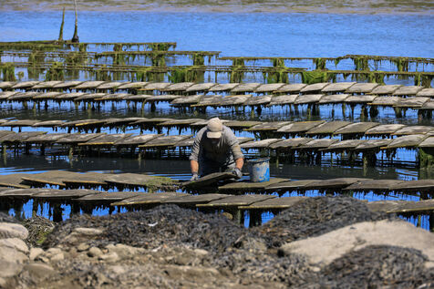 An oyster farmer turns the bags of oysters in his oyster farm in Saint Cado near Belz in Morbihan, Brittany, western France, on July 16, 2025.