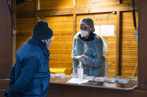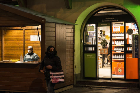 A woman health worker works alone in a COVID 19 doing antigenic testing in a stand in front of a pharmacy in Strasbourg. These tests are faster than PCR tests. A fifth wave of the global pandemic is ongoing in France with tens of thousands of positive cases of COVID registered each day. New restrictions have been anounced, amidst the Omicron variant's propoagation and before winter holidays.