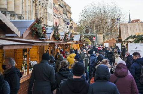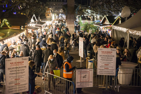 En pleine cinquième vague de la pandémie de COVID 19, à Strasbourg et depuis mardi 7 decembre, l'accès à une troisième place du marché de Noël, la place du Chateau, est conditionné à la présentation du pass sanitaire. Des panneaux indicatifs rappellent les règles en vigueur selon les espaces. Le port du masque est obligatoire sur la Grande Île et des zones de restauration ont été installées sur les marchés de Noël. Le premier ministre Jean Castex sera en visite ce vendredi 10 decembre. Prises de vues les 6 et 7 décembre 2021.