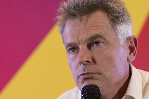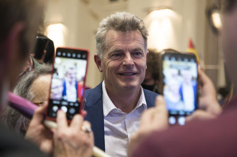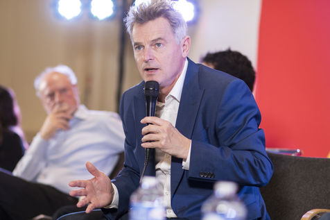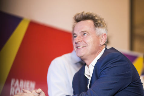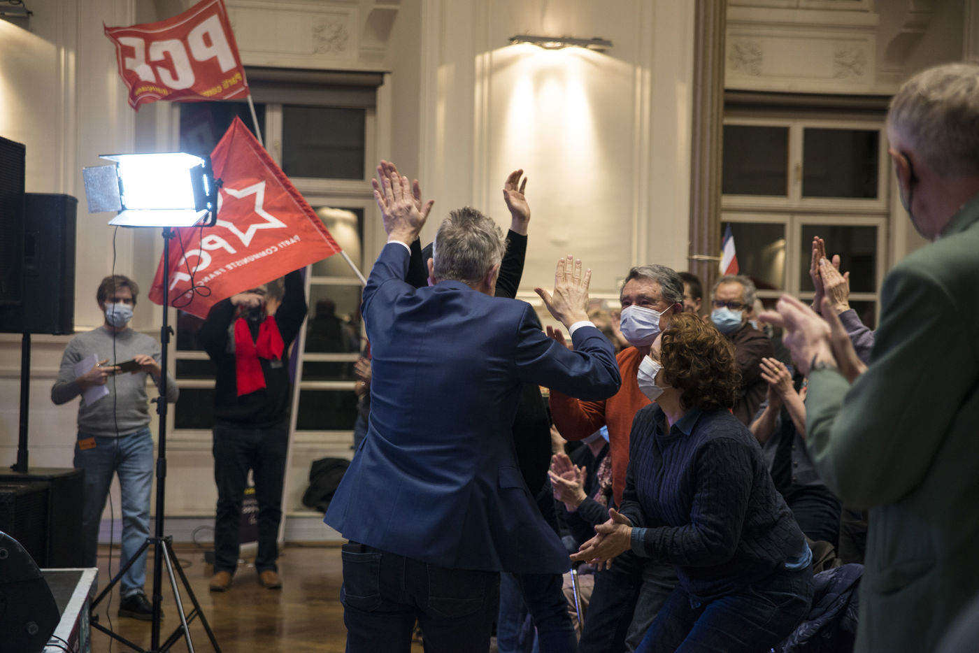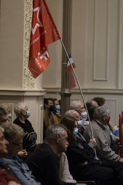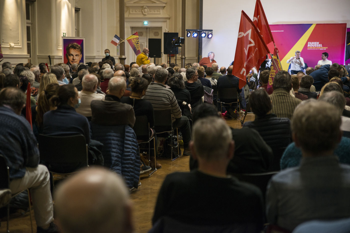 French Communist Parti (PCF) candidate to the 2022 presidential election Fabien Roussel holds a meeting in Strasbourg in a room of the L Aubette building near place Kleber.
