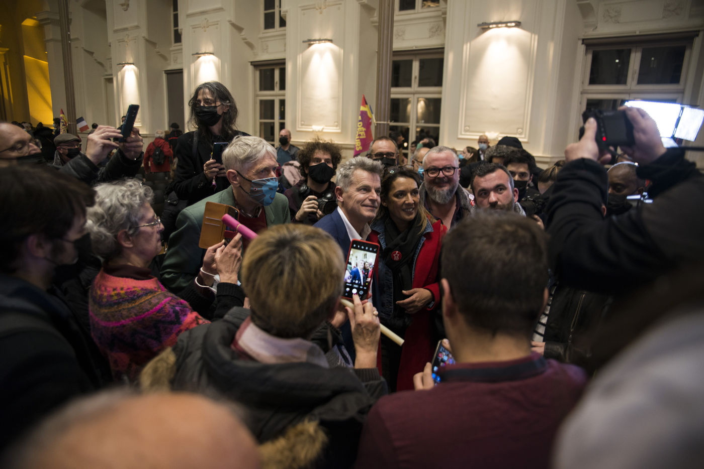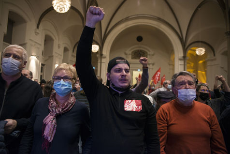 Le candidat du Parti Communiste Francais (PCF) à l'élection présidentielle 2022, Fabien Roussel, tient un meeting a Strasbourg dans une salle du bâtiment de l'Aubette pres de la place Kléber devant plusieurs centaines de militants et curieux du Grand-Est.