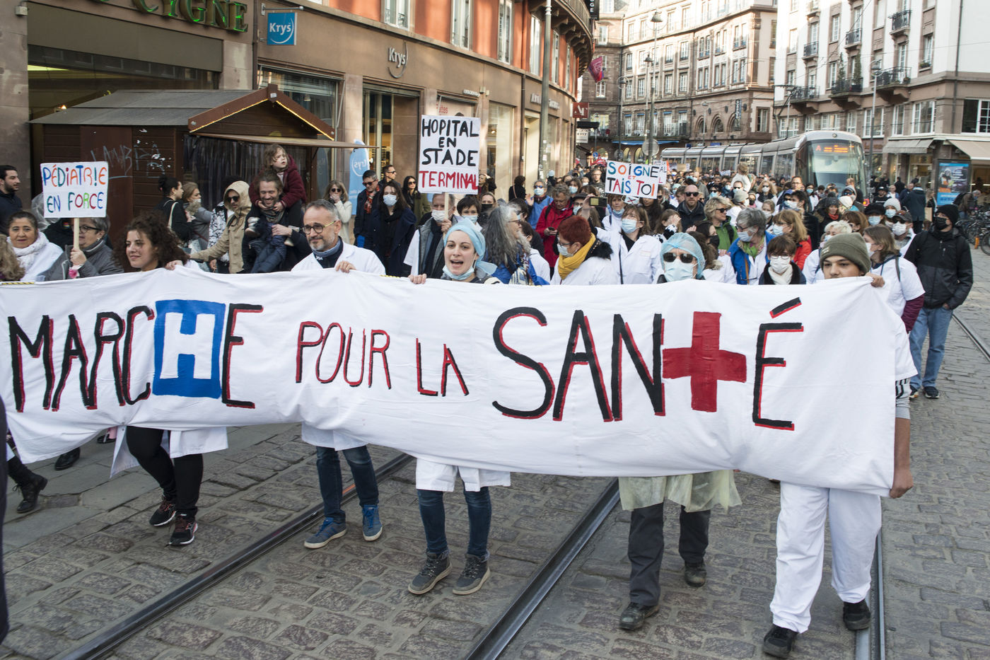 Des soignants manifestent contre la déterioriation de l'hôpital public et pour sa survie à Strasbourg.