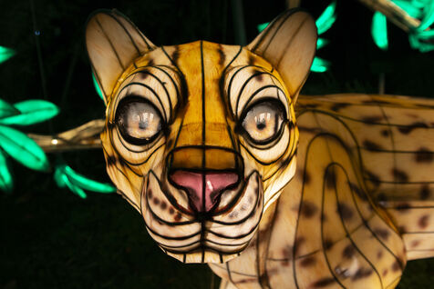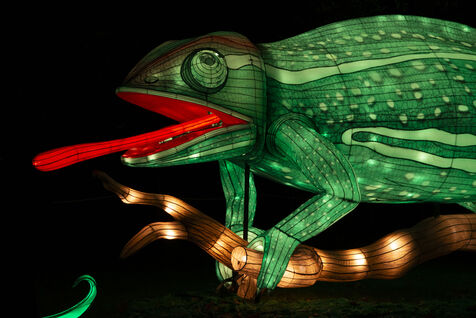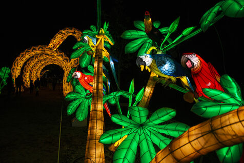 These photographs show a view of the Jungle En Voie d Illumination light exhibition by the Museum of Natural History at the Jardin des Plantes, depicting the biodiversity fauna and flora of tropical humid forests in Paris.