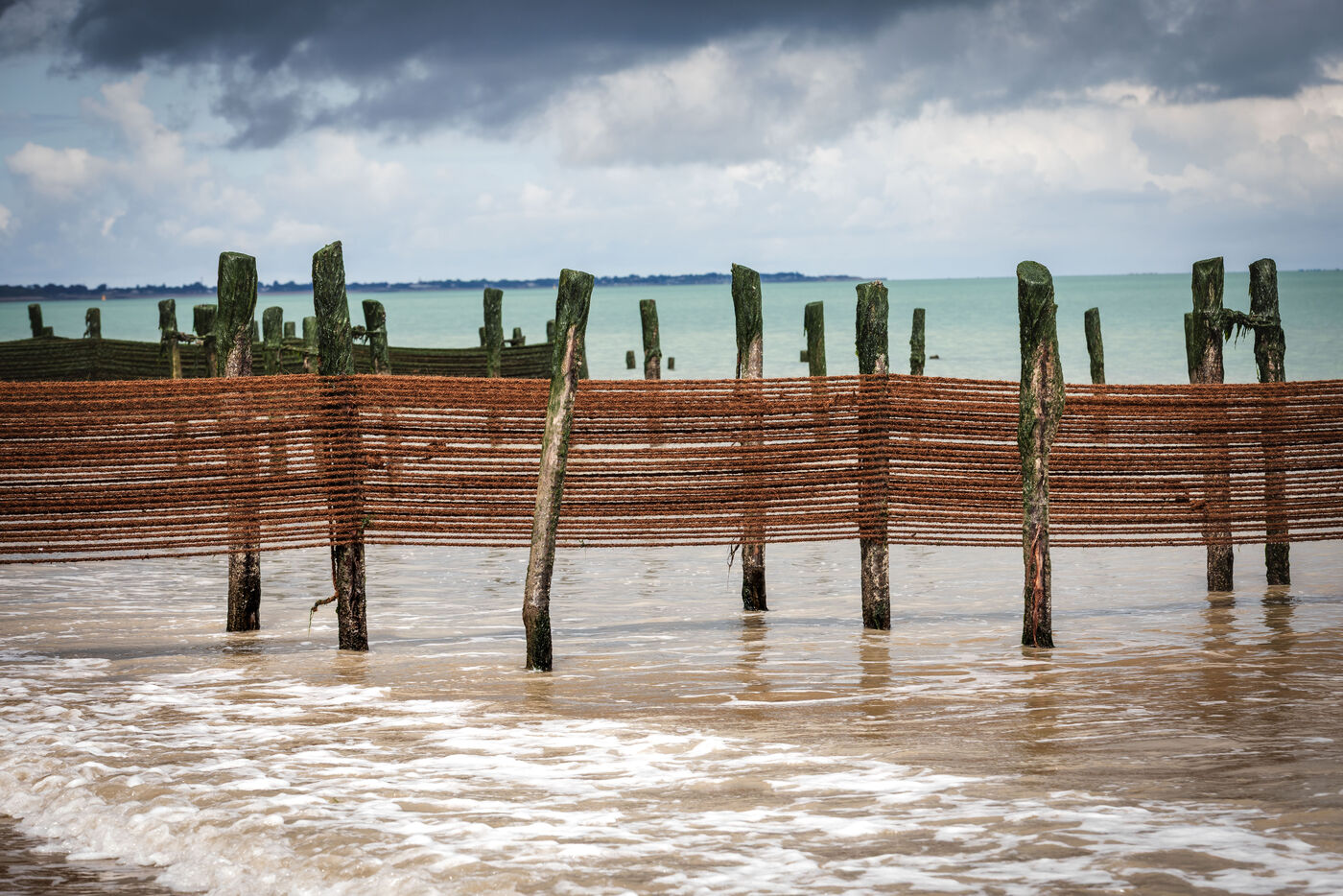 It's on the Saumonards beach, on the outskirts of the famous Fort Boyard, that the work of raising mussels begins. The first step is the collection stage: long coconut fiber ropes are installed on wooden stakes along the beach for several months (between February and May). This ancestral technique enables the mussel larvae (spat) to attach themselves to the ropes and develop. By May, the spat are large enough to move the ropes.The ropes are then unhooked, wound into mantles (each mantle contains 100m of rope filled with spat) and sold to breeders who will allow the mussels to grow to adult size.