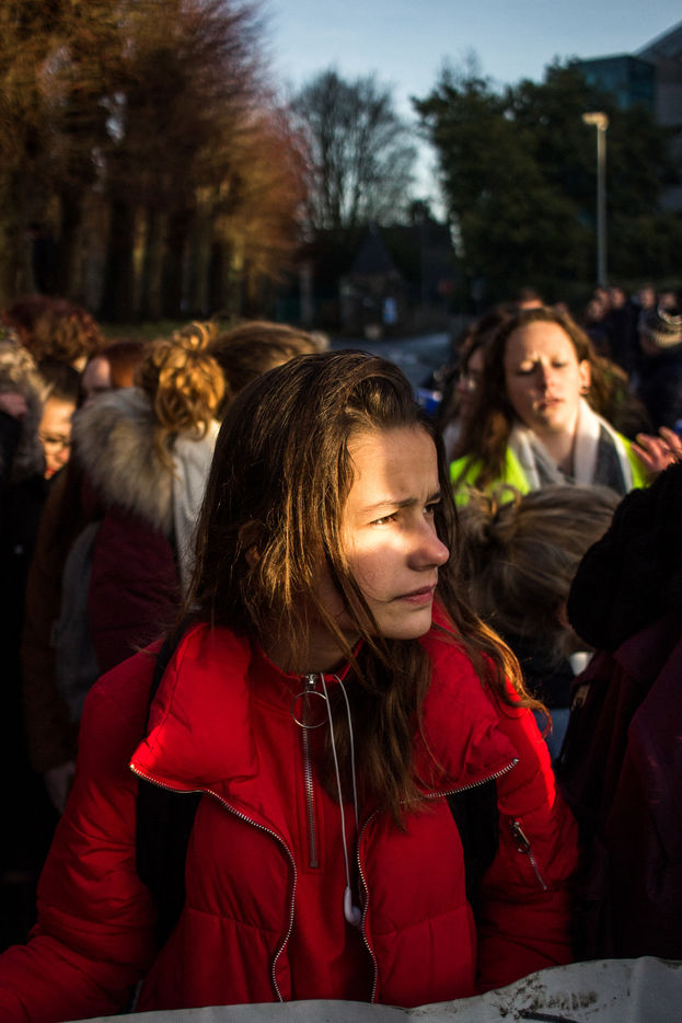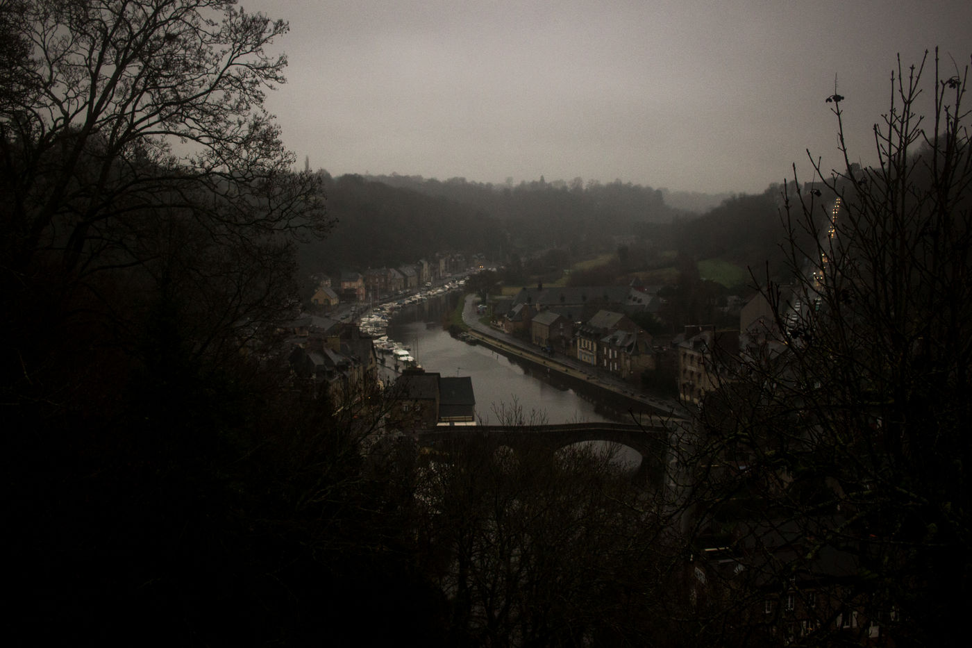 Des gens en jaune et du brouillard (Dinan, Bretagne)