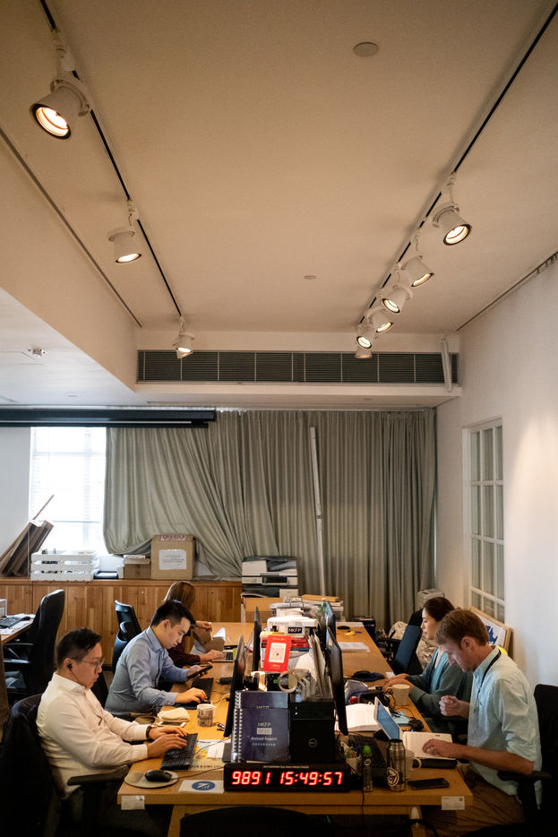 C'est au sein d'un espace de coworking que travaille cette équipe studieuse de quatre personnes. Au bout de la table, on trouve un décompte jusqu'en 2047, date à laquelle Hong Kong sera completement rétrocédé à la République Populaire de Chine. Ils disposent également de matériel vidéo plutôt rudimentaire. Leur méthode de couverture privilégié pour l'actualité est le Live Facebook. « La vérité a été cassé par la police, par le gouvernement et par la propagande. Nous revenons aux fondamentaux du journalisme, la vidéo et les faits, sans filtre ni montage. » explique Tom Grundy. Tom peut également compter sur Kris Cheng pour superviser le médias. Cet hongkongais trentenaire est celui qui dispose de la plus grande expérience au sein de l'équipe. Il est présent au sein de l'aventure depuis le début et il était auparavant correspondant pour de nombreux titres de presse internationale comme The Washington Post. Il s'est lancé au coté de Tom car il avait déjà l'habitude de traiter l'actualité en anglais et qu'il voulait pouvoir le faire pour les Hongkongais. Jennifer Creery, âgée de 24 ans, travaille également à leur coté depuis plus d'un an et demi. Elle est née à Hong Kong mais a grandit au Royaume-Uni. Alors qu'elle suivait des études de Chinois à Taiwan, elle les rejoignit par intéret pour les questions
