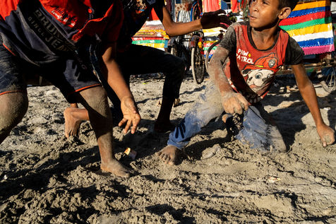 Pratab Nagar au Sud du pays dans la province rurale de Shatkira. Ici, il semble être déjà trop tard. Tout est gris, envasé, salinisé. Dans ce village de ce delta auparavant particulièrement fertile, l'activité économique principale est devenu l'aquaculture. Les habitants vivent au rythme des marées qui, environ trois heures par jour, submergent une partie de leurs maisons. La majorité des hommes du village sont eux employés à construire une digue qui a pour vocation de protéger le territoire des futures submersions.