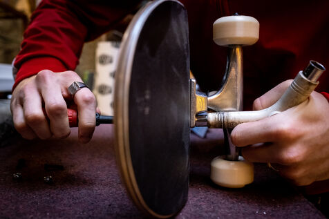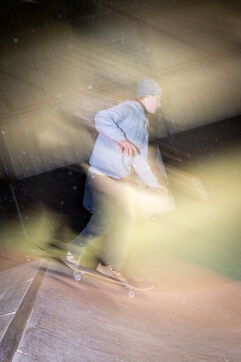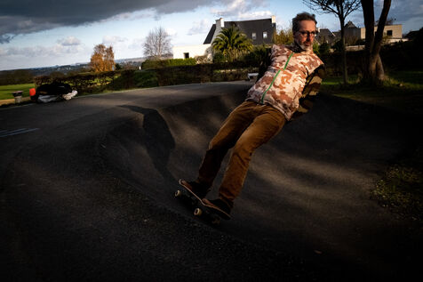 Christophe, also a pioneer member of the association, is known and recognized in the agglomeration for teaching skateboarding to beginners. His public is very large: individuals, schools and even prisoners from the Saint-Brieuc prison. That day, two of his pupils were present at the hall. With benevolence, he helps them to apprehend their first tricks despite the legitimate fear of launching themselves for the first time on a ramp. ?Christophe regularly visits different sites in the area to skate: the pumptrack in Langueux, "great for those who like speed"; the spot in front of the IUT, "more urban for those who want to do street"; and the skateparks in Balzac and Parc des Promenades. The association has fought hard for the construction of its municipal facilities and in particular the latest skatepark. "Before 2014, there was practically nothing in Saint-Brieuc, which is not worthy of a city like this. The Balzac skatepark was a first positive point," recalls Nicolas. In 2019, the big skatepark of the Promenades arrived like a godsend for the local riders. "It's good because it was built by real skatepark builders and not by some construction companies responding to public tenders as is often the case in other cities," insists Christophe.