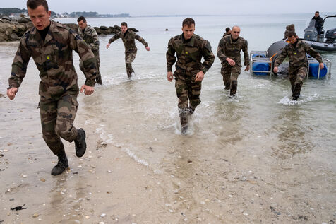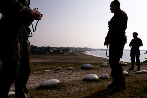 Reportage sur le stage d'aguerissement de la formation de l'Ecole militaire interarmés au Fort de Penthièvre sur la Presqu'île de Quiberon dans le Morbihan en Bretagne. L'EMIA recrute ses élèves parmi les sous-officiers et les militaires du rang selectionnes par concours. Les eleves-officiers suivent une formation de deux ans. A l'issue de la première année, ils sont nommés au grade de sous-lieutenant, puis de lieutenant a la fin de la seconde année.
