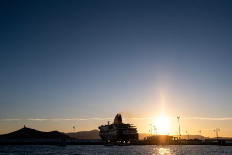 A winter journey through the Cyclades archipelago on the Aegean Sea. Here from the ferry to the island of Naxos.