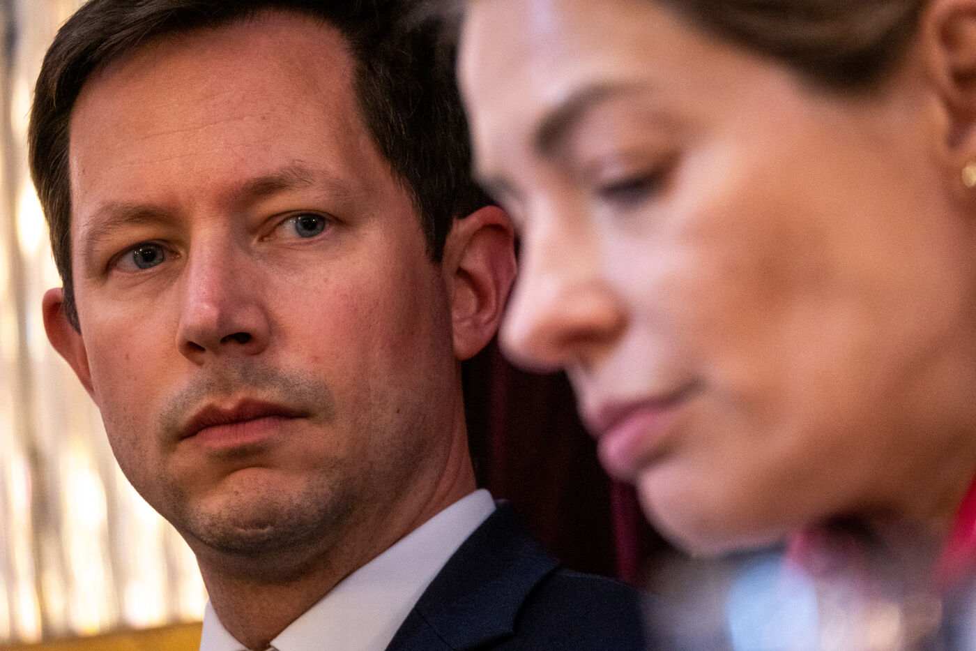 François-Xavier Bellamy en conférence de presse avec sa colistière Celine Imart