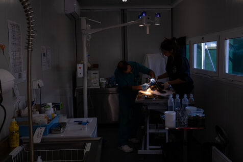 Les vétérinaires veillent aussi de près sur les tortues. Ils passent effectuer des relevés ou encore installer une perfusion. Parfois, ils emmènent une tortue dans le bloc opératoire pour des interventions plus complexe. Les tortues doivent parfois être amputés d'une ou plusieurs nageoires. « Malgré cela, elles peuvent souvent retourner dans la nature, ce sont des animaux puissants. » nous dit la biologiste. Des poids sont souvent fixés sur les carapaces des tortues. Les blessures à la tête causant des troubles neurologiques, l'installation de plaques de métal lestées leur aident à retrouver l'équilibre et à nager de nouveau.