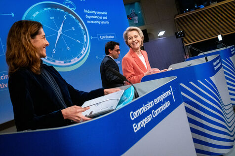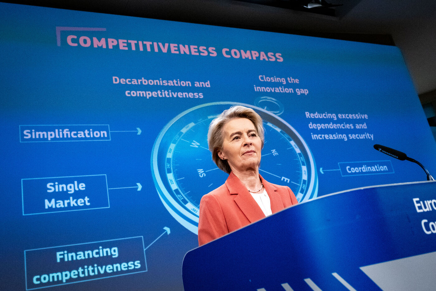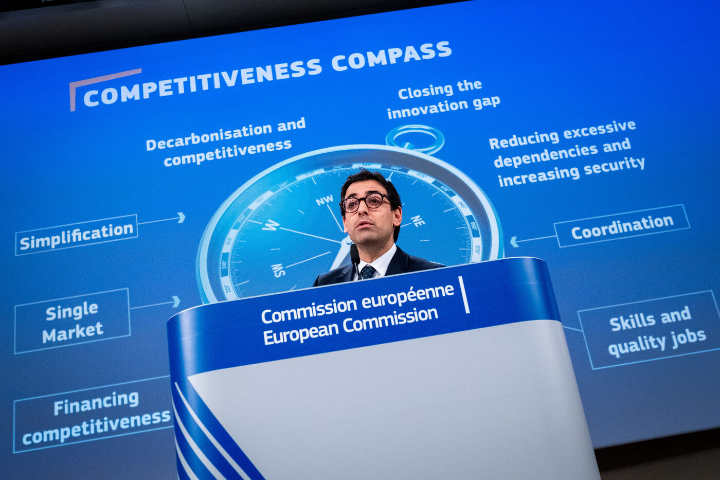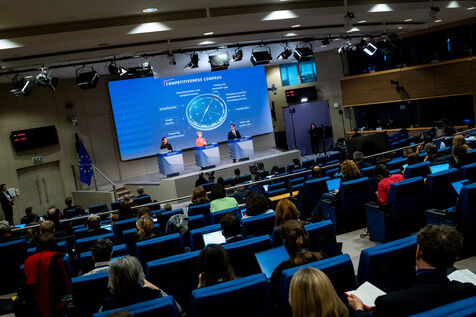 Press conference by President Ursula Von Der Leyen and Vice-President Stéphane Séjourné on the European Union's Competitiveness Compass. The Commission presents the competitiveness compass for Europe to become the place where clean technologies, services and products are invented, while being the first continent to become climate neutral, based on the Draghi report.