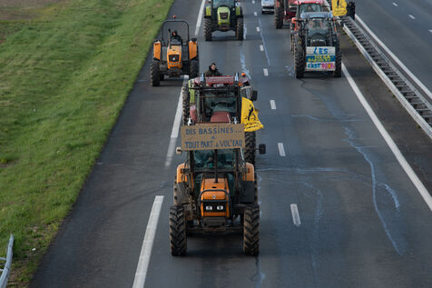 Dozens of tractors took to the road on 24 March 2023 to travel to Vanzay in the Deux Sevres to attend the weekend of mobilisation against the mega-pools. The convoy was stopped at exit 41 of the N10 by the police, before continuing its journey.