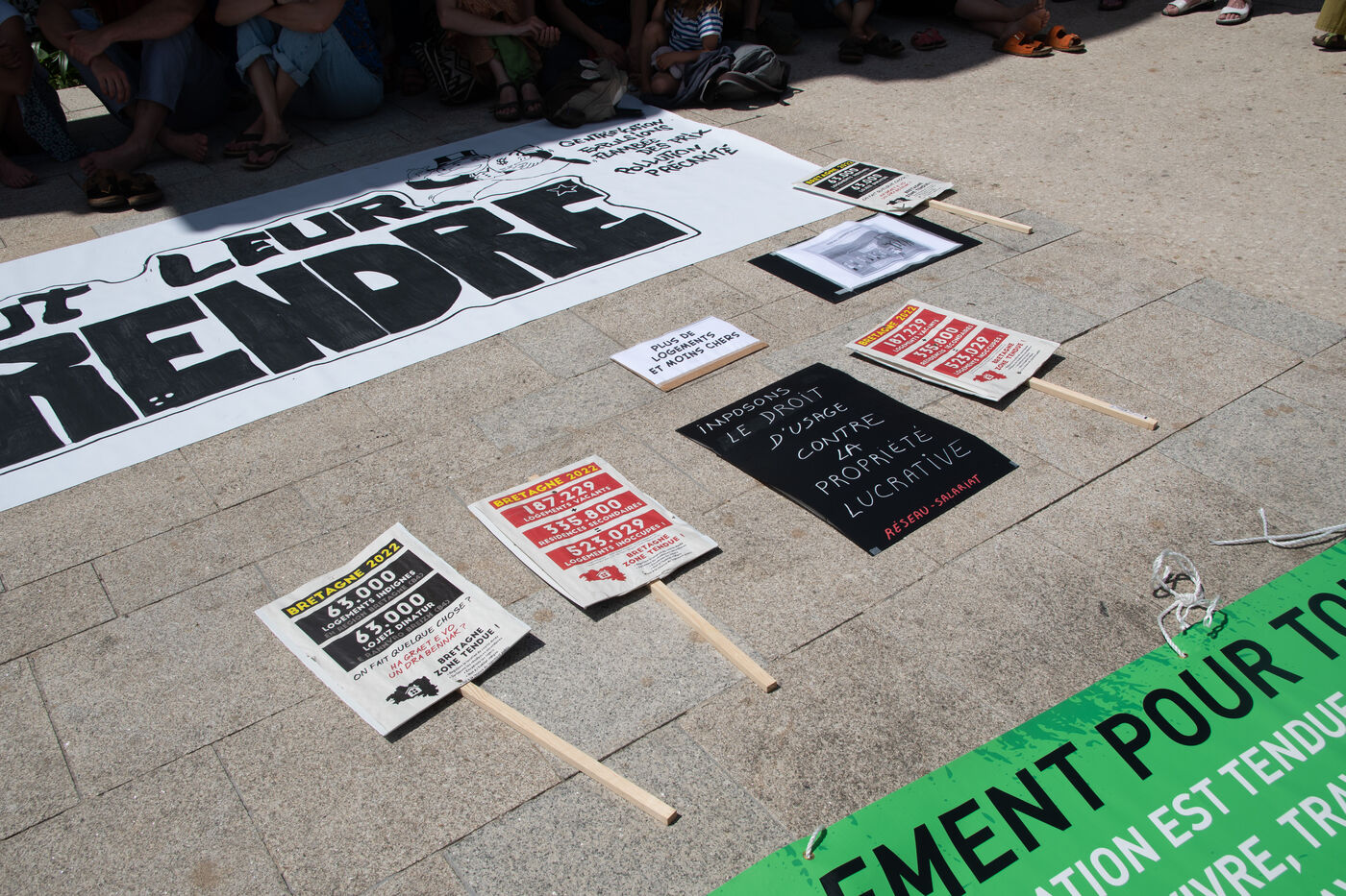 Several Breton groups campaigning for the right to housing organised a demonstration against inadequate housing on 10 June 2023 in Douarnenez. Following speeches by various groups (Droit à la ville in Douarnenez, Tous.tes un toit in Lorient, Toit toit mon droit in Concarneau, la Maison du peuple in Nantes, etc.), over 200 people demonstrated in the streets of Douarnenez. The demonstrators held up placards reading "Housing for people, not for money" and "No closed shutters, no gilded ghetto". The procession stopped in front of some of the housing projects challenged by the demonstrators, such as l'abri du marin, a former social housing site that is to be transformed into luxury flats at €8,000 per m2, and Ker cachou, where flats at over €4,000 per m2 are to be built.