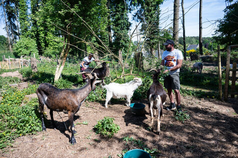 Les animaux sauvages et domestiques cohabitent dans ce bel espace. Les deux ânes, les deux poneys ainsi que les poules vivent en liberté sur le site. On y trouve également des cochons, des chèvres, des moutons, des vaches, des cochons d’Inde, un lapin, deux furets, un chien et des chats. Tous les animaux sont issus de sauvetages, certains proviennent de saisies judiciaires, d’abandons, de cas de maltraitance ou encore de l’industrie laitière, comme ces agneaux arrivés bébés et nourris au biberon. Bien que des pâtures soient prêtées par la commune, le site est en limite de capacité et ne peut accueillir davantage d’animaux. Des bénévoles, dont certains permanents, participent au bon fonctionnement du sanctuaire et au nourrissage des animaux.