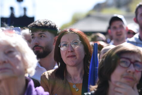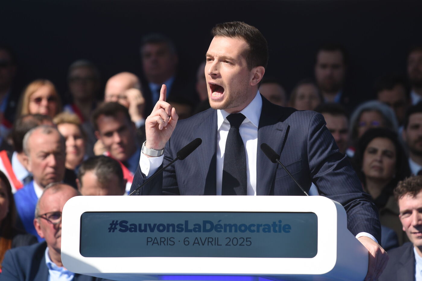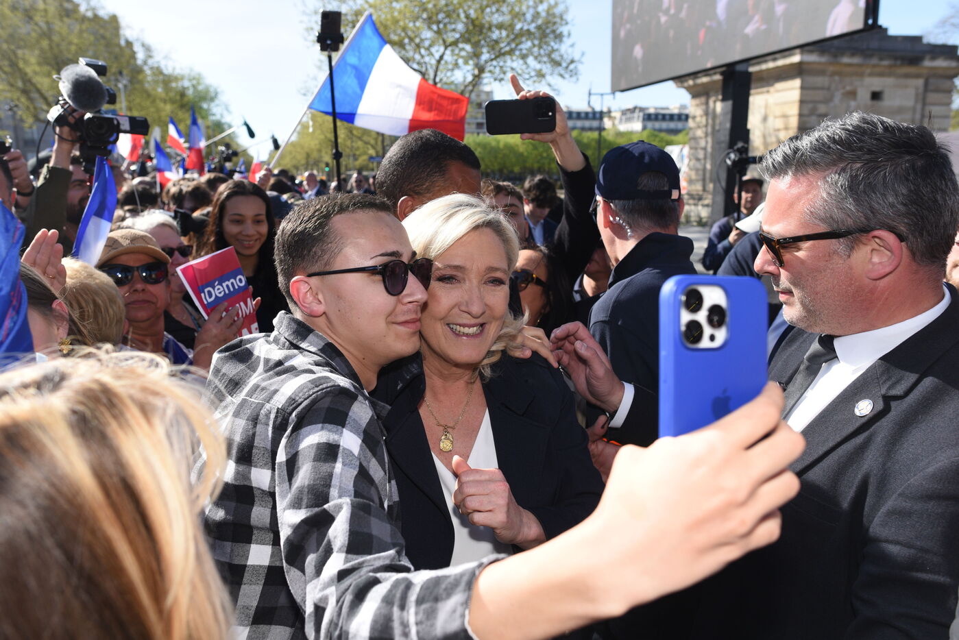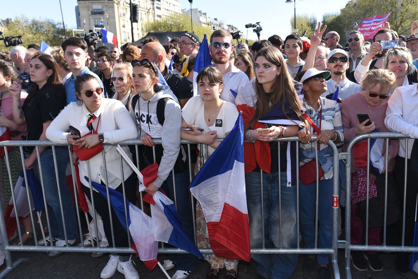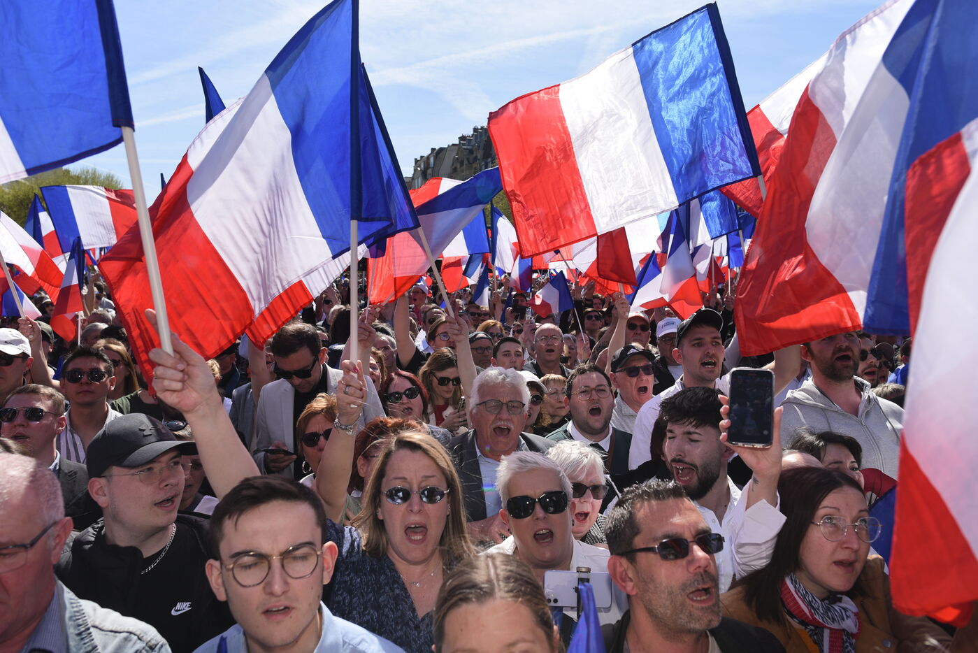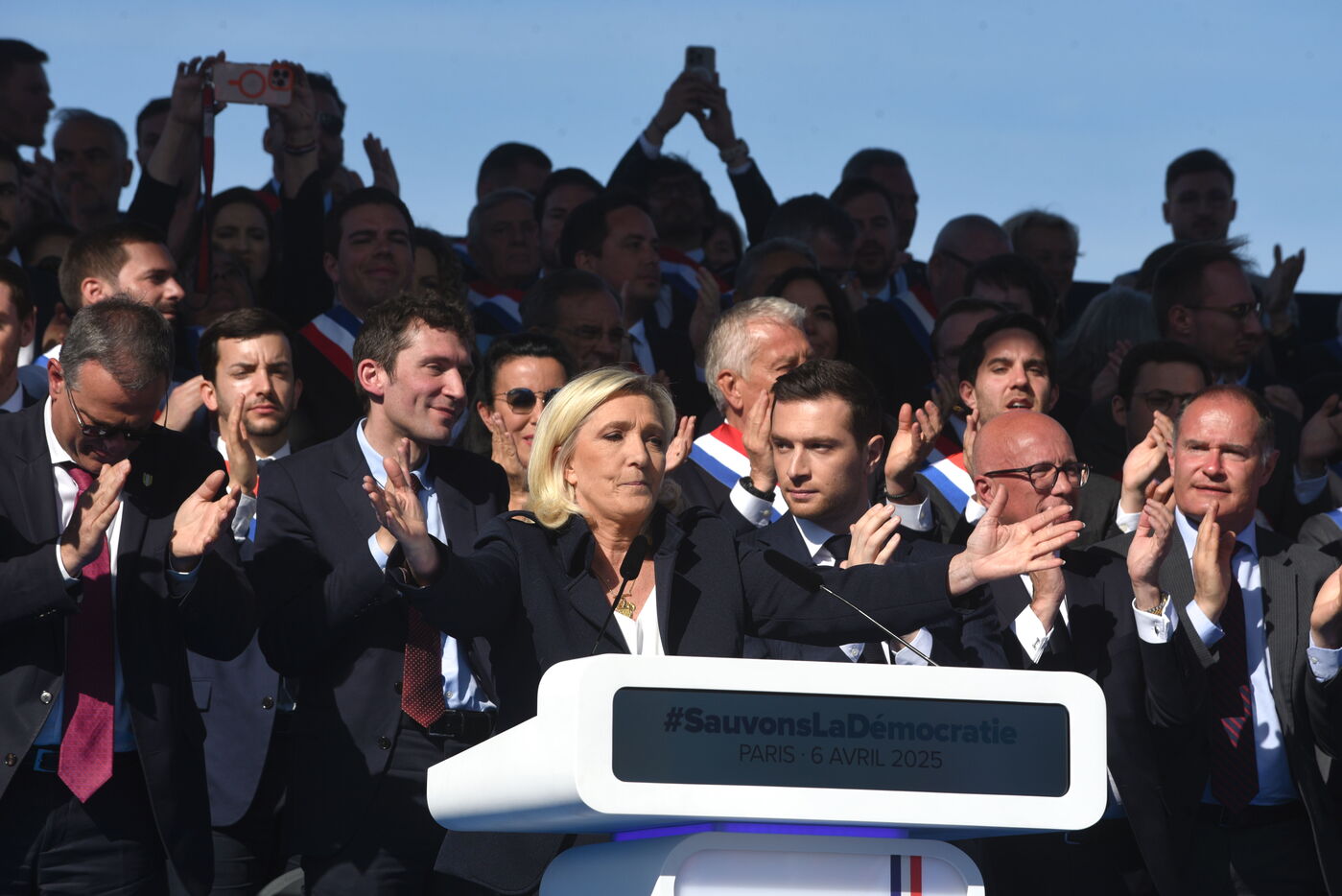 Rassemblement National (RN) supporters attend a rally in support of Marine Le Pen after the French Far Right leader was found guilty of embezzlement and banned from taking part in elections.Thousands of RN supporters gathered at the rally, during which RN leaders vowed to fight what they called a "political decision".