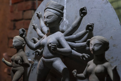 Meme si la fabrication d idoles a generalement ete l oeuvre des hommes, ces dernieres annees, les femmes sont egalement autorisees a construire les idoles. Les potiers utilisent des materiaux respectueux de l environnement et reutilisables pour l idole. Le bambou et la paille sont utilises pour la structure et la stratification se fait avec de l argile. Ce qui est particulierement interessant et intrigant est un rituel habituel de melanger l argile d un bordel avec l argile de la fabrication d idoles. L idole serait incomplete sans utiliser l argile ou le punya maati (terre benie) du bordel ou nishiddopalli (territoire de fordibben). Kumartuli utilise le punya maati de Sonagachi, qui est la plus grande zone de lumiere rouge d Asie.