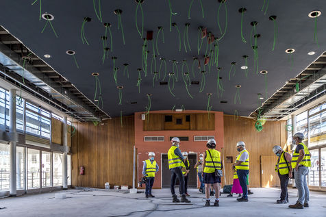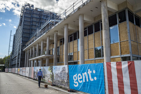 Since the beginning of 2020 are going on the renovation works of the old city library of the city of Ghent in Woodrow Wilsonplein. Today, 21 august 2020 the work keeps going on till the end of 2020 when the renovation works must be completed. Part of the work are already done. The structural work of the tunnel that connects the car park under the current AC Zuid and the basement of the old city library and a data center in the basement that will create an ultra-modern IT infrastructure with the data center on the Prins Filip campus. Along with innovation also the works pay attention to the heritage. The old city library, designed by the well-known Ghent architect Geo Bontick in 1955, is indeed considered a valuable historical patrimony. Authentic heritage elements are therefore being restored. Among other things, the wooden parquet and paneling in the Achilles Musschezaal on the second floor, and the starry sky in the former entrance hall are carefully restored. A conference center is being set up in the Achilles Musschezaal and there will be plenty of space for workplaces to do meetings and collaboration.