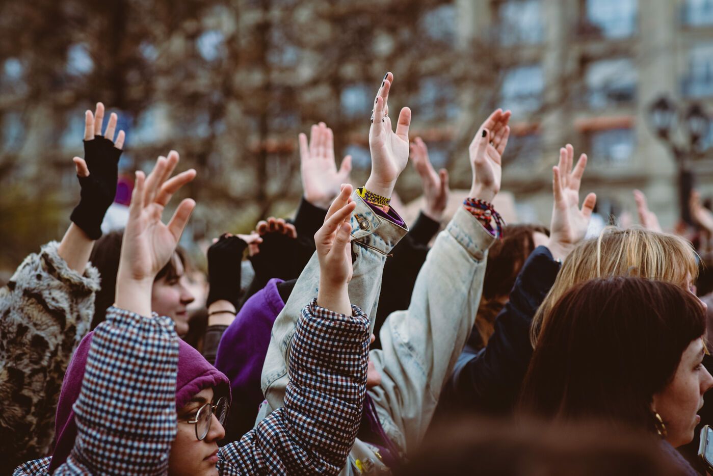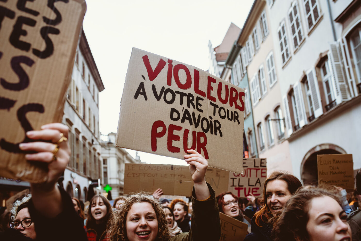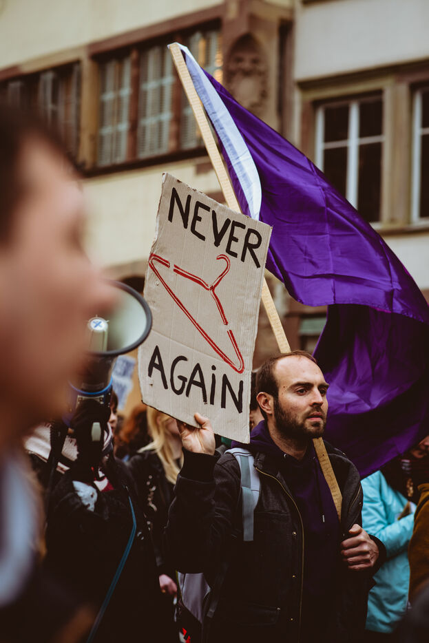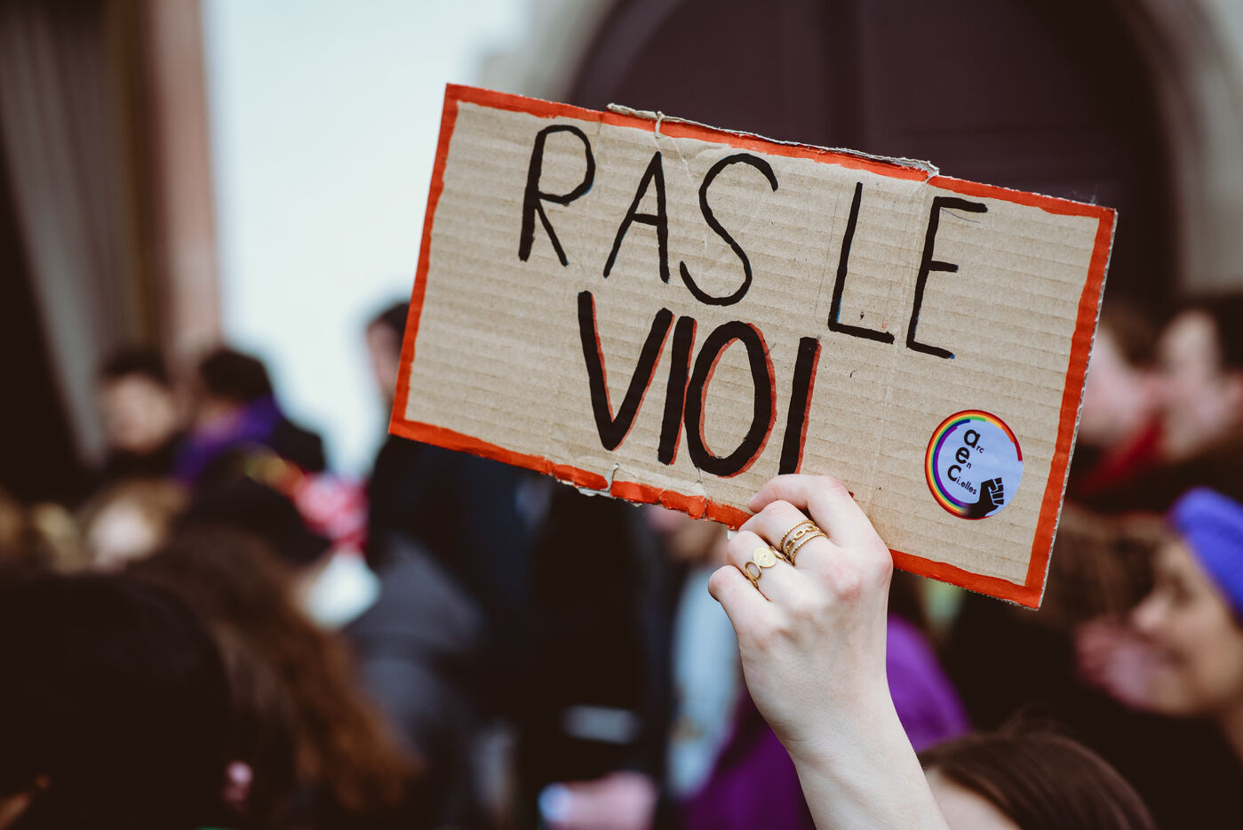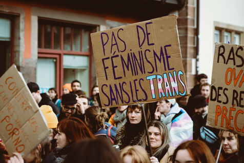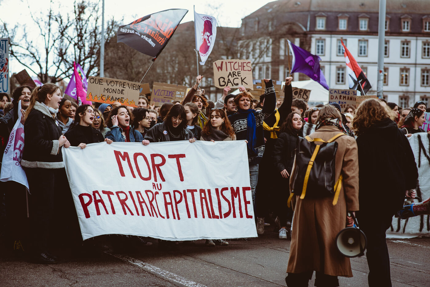 France, Strasbourg, 03-08-2023. Marche féministe à l'occasion de la journée de lutte pour le droit des femmes. Plus de 2000 personnes ont défilé. Tête de cortège en mixité choisie, suivie d'un cortège mixte puis des syndicalistes. Photo Mathilde Cybulski / Hans Lucas.