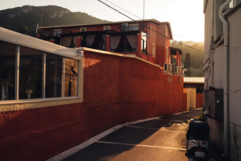 Grece, Corfou, Aout 2023. Immersion estivale sur l'ile de Corfou, bordée par la mer Adriatique et la mer Ionienne, en pleine saison touristique. Son patrimoine culturel riche, herité de plusieurs années de domination Française, vénitienne et Britannique contraste avec ses scènes de vie typiques des stations balnéaires très fréquentées. Photo Mathilde Cybulski / Hans Lucas.