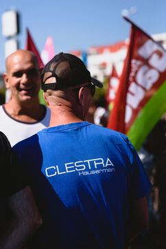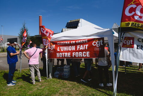 France, Illkirch-Graffenstaden, 05-09-2023. Mathilde Panot et Emmanuel Fernandes, députés LFI, apportent leur soutient aux grevistes de l'usine Clestra. Les employés sont en greve depuis plus de deux mois suite à la reprise de l'entreprise par le groupe Jestia. Photo Mathilde Cybulski