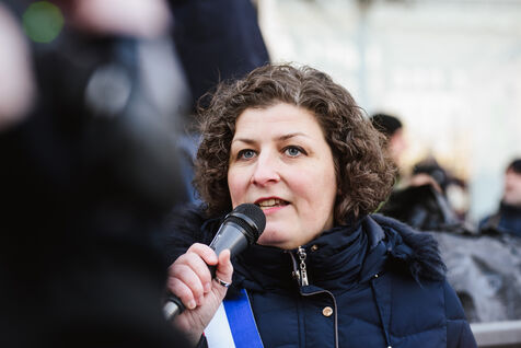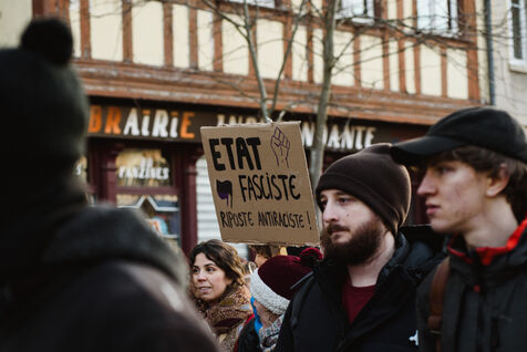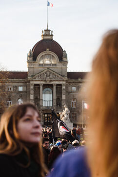 France, Strasbourg, 21-01-24. Around 3,000 people took part in the demonstration against the law on asylum and immigration. The procession started from Place Kleber after a speech by Mme Barseghian, Mayor of Strasbourg, to join Place de la République. Photo Mathilde Cybulski / Hans Lucas.
