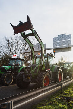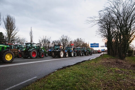 France, Strasbourg, 24-01-24. Blockade of the A35 freeway for farmers' mobilization. Several hundred tractors block the freeway to denounce the new environmental standards that are undermining the profession. Photo Mathilde Cybulski / Hans Lucas.