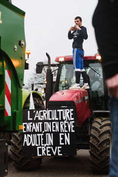 France, Strasbourg, 30-01-24. Nouveau blocage de la M35 par les agriculteurs. Encore plus nombreux que lors du premier blocage, plusieurs centaines d'agriculteurs bloquent l'autoroute avec leurs tracteurs et comptent y passer la nuit. Photo Mathilde Cybulski / Hans Lucas.
