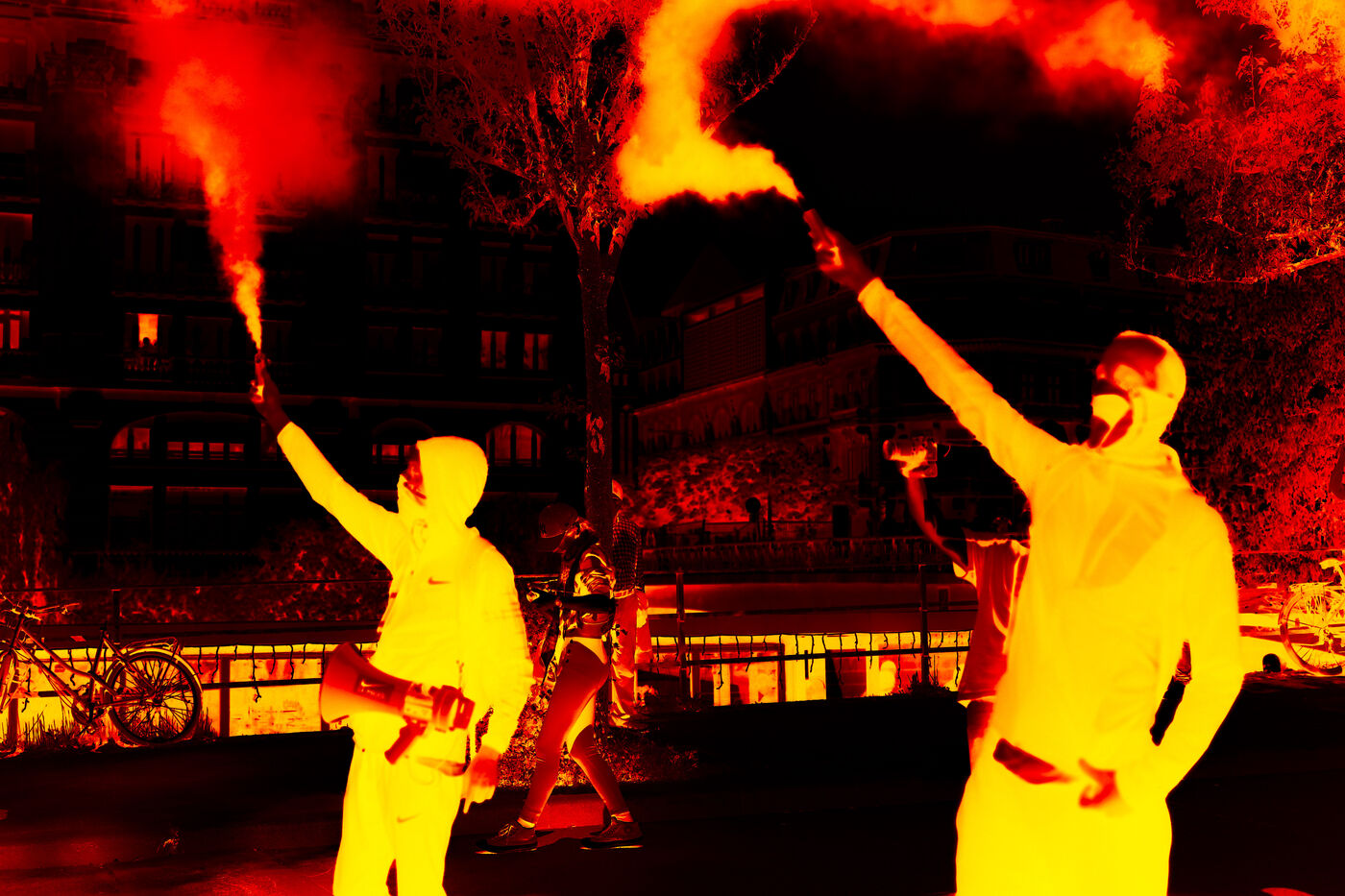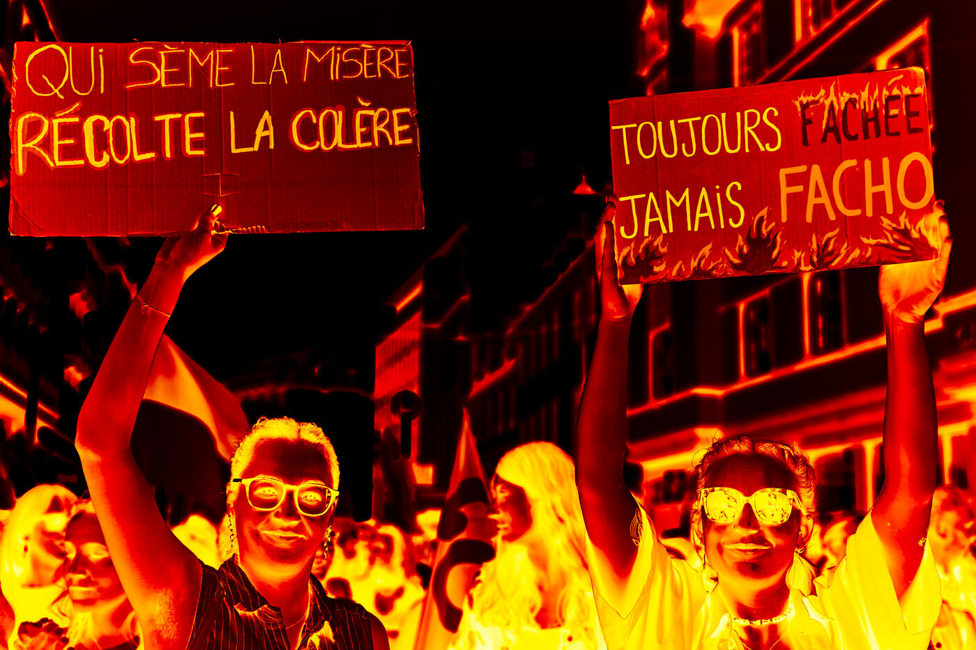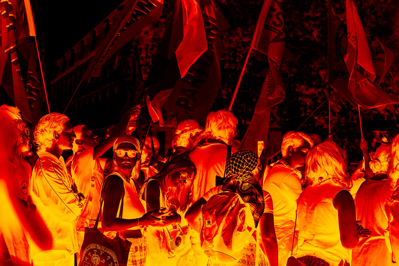 Strasbourg, May 1st 2025. On the ashes of their charred rights, the workers' cortege ignites. A blaze of anger, fueled by precarity and hope. I chose to translate this malaise into burnt, inverted images. In the negative, bodies become flames, and words appear with clarity. A muted tension, rekindled by every social setback.