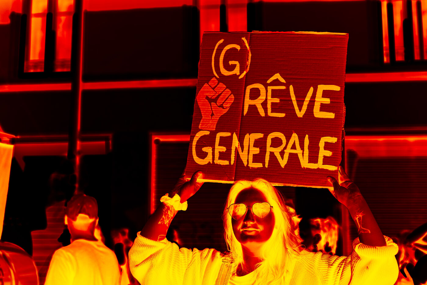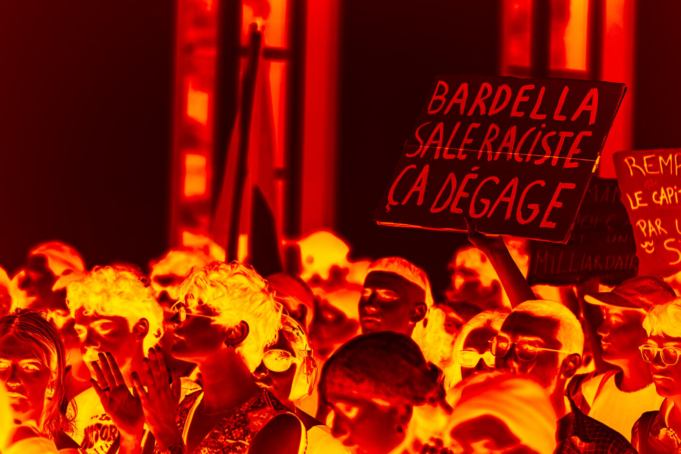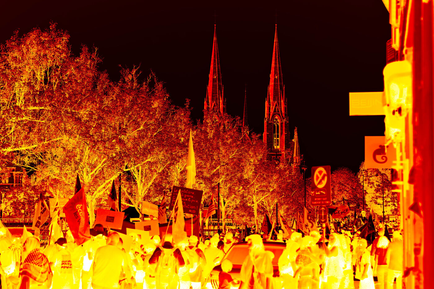 Strasbourg, May 1st 2025. On the ashes of their charred rights, the workers' cortege ignites. A blaze of anger, fueled by precarity and hope. I chose to translate this malaise into burnt, inverted images. In the negative, bodies become flames, and words appear with clarity. A muted tension, rekindled by every social setback.