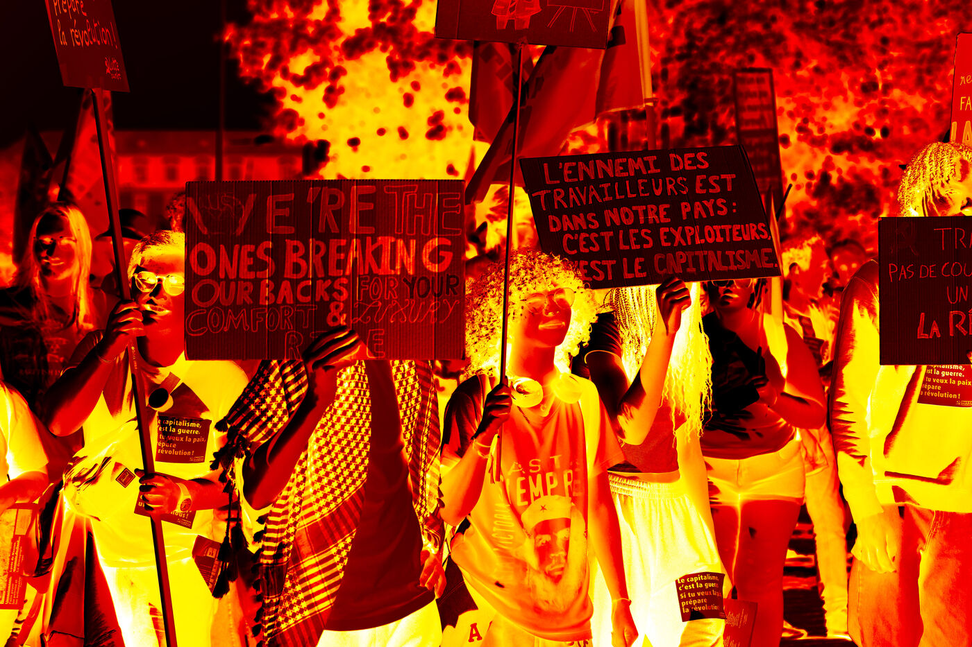 Strasbourg, 1er mai 2025. Sur les cendres de leurs droits calcines, le cortege des travailleurs s embrase. Un incendie de coleres, alimente par la precarite et l espoir. J ai choisi de traduire ce malaise en images brulees, inversees. Dans le negatif les corps deviennent flammes, et les mots apparaissent avec clarte. Une tension sourde, ravivee a chaque recul social.