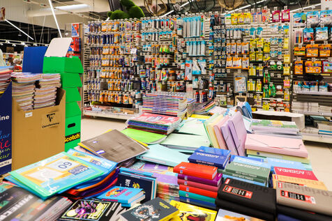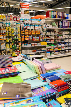 A section of school supplies for the start of the school year in September in a supermarket in the Aude, Côte du midi.