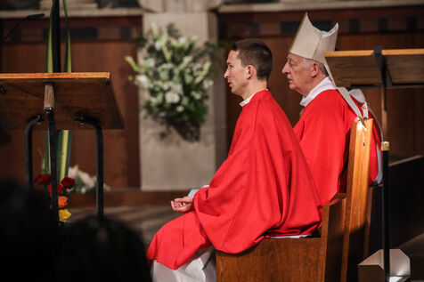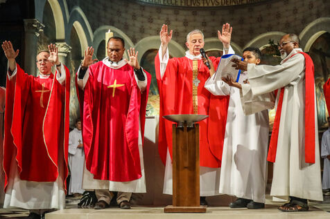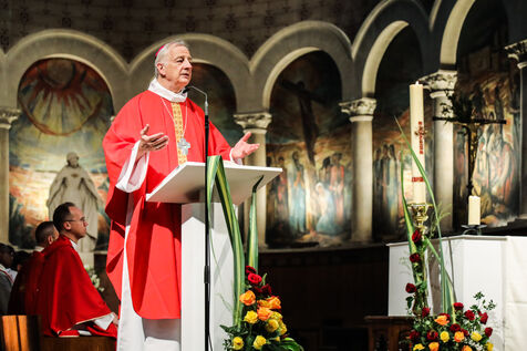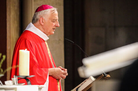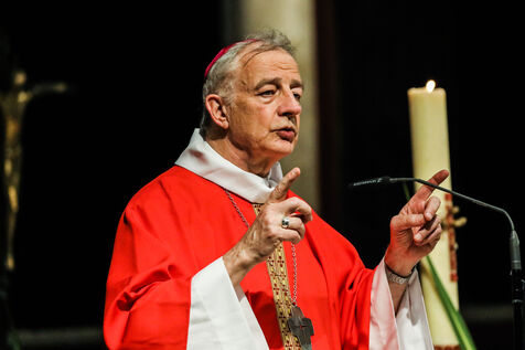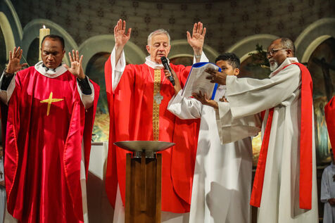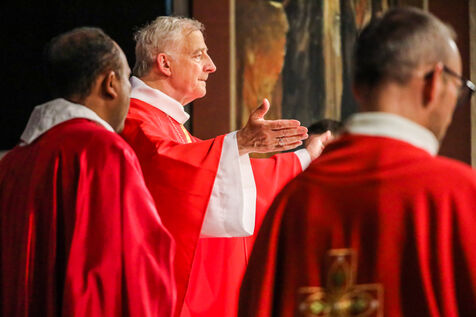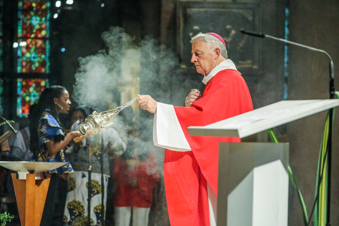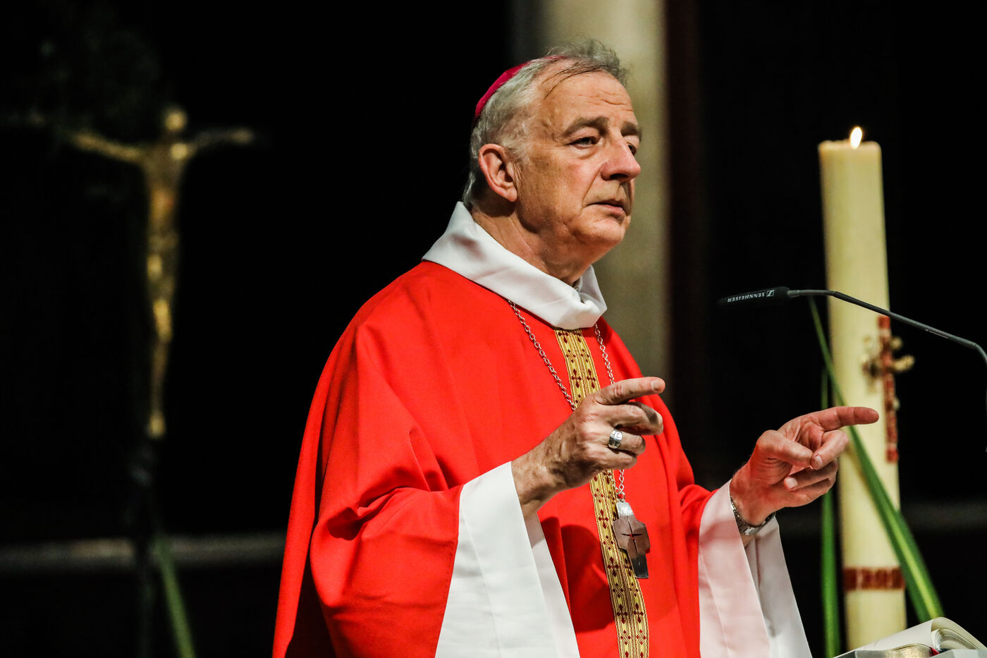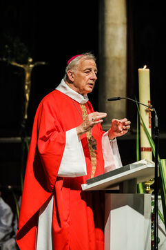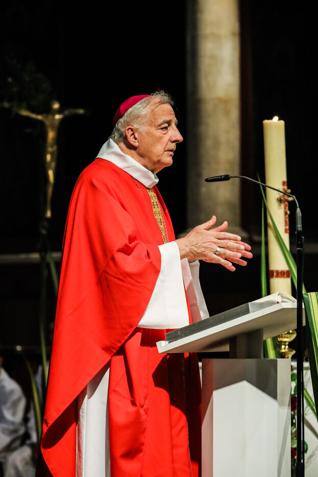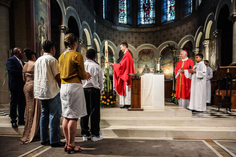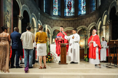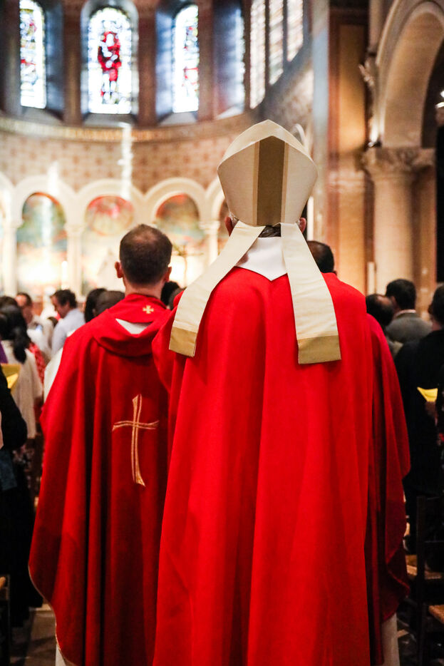Monsignor Philippe Marsset, auxiliary bishop of the archdiocese, in the Church of Notre-Dame-de-la-Gare in Paris 75013, at the confirmation Mass for 19 young people from the NDG chaplaincy and the Madagascan chaplaincy on 28 May 2023.