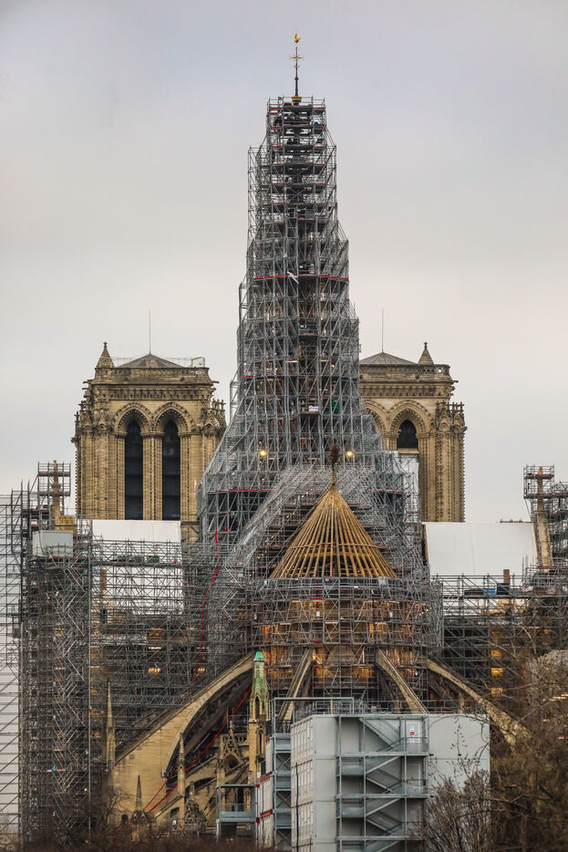 Travaux de reconstruction de la cathédrale Notre-Dame de Paris, suite à l'incendie du 15 avril 2019. Travaux de la flèche et de la charpente en bois.