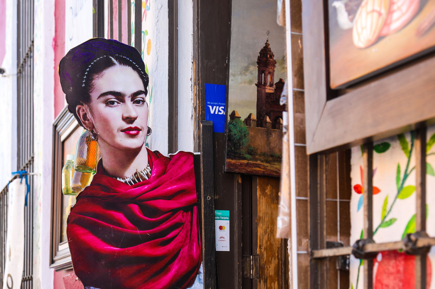 Portrait et objets de Magdalena Frida Carmen Kahlo Calderón1, simplement appelée Frida Kahlo, artiste peintre mexicaine, née le 6 juillet 1907 à Coyoacán (Mexico) et morte au même endroit le 13 juillet 1954.