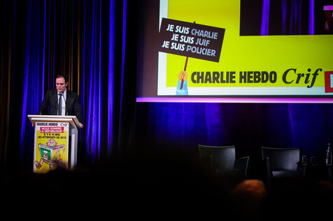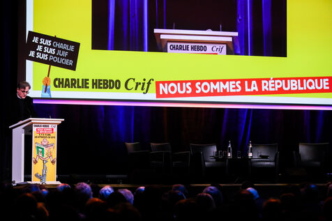 Evening of debates and tribute to the victims of the Hyper Cacher attack (Francois-Michel Saada, Yoav Hattab, Yohan Cohen, Philippe Braham) and Charlie Hebdo in January 2015 organized by Charlie Hebdo and the Crif at the Maison de la Mutualité in Paris, France on January 9, 2025.