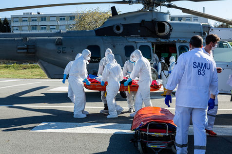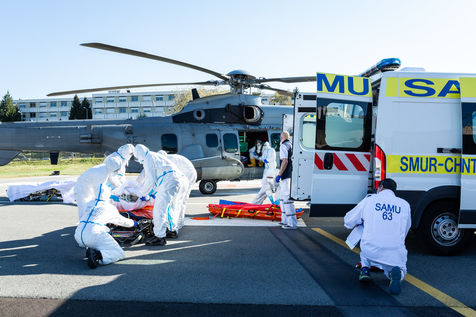 La mission RESILIENCE de l'Armée Française, met à contribution sa force aérienne pour realiser des transferts de patients entre les hôpitaux parisiens et les structures de province. Les Patients sont arrivés à Clermont-Ferrand avant d'être transférés dans les services de réanimations.
