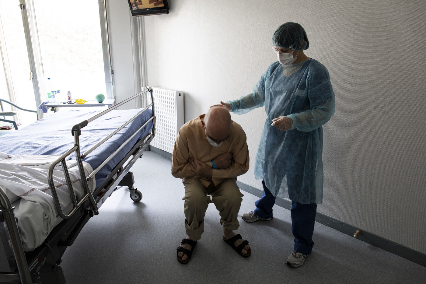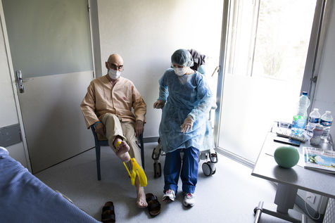 Exercices de kinésithérapie en service de Soins de Suite et Réadaptation (S.S.R) qui aident les patients à retrouver une condition physique pour un retour prochain à domicile. Après l'affaiblissement dû au COVID-19, les patients nécessitent des soins particuliers afin de récupérer une autonomie. Malgrés les gènes respiratoires encore présentes, les progrés sont très rapides. Une surveillance médicale est toujours présente afin d'écarter toute complication ou récidive d'une phase aigüe.