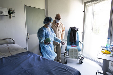 Physiotherapy exercises in the Aftercare and Rehabilitation (A.R.R.C.) department that help patients get back in shape for an early return home. After the weakening due to COVID-19, patients require special care in order to regain autonomy. Despite the respiratory genes still present, progress is very rapid. Medical supervision is always present to rule out any complications or recurrence of an acute phase.