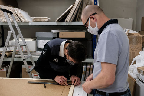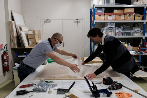 For the time being, the teams are busy putting the works in frames, designing the room's scenography and setting up the elements of the visit.