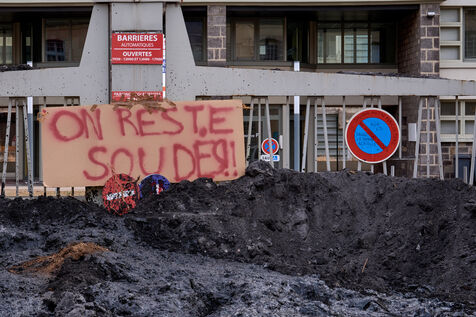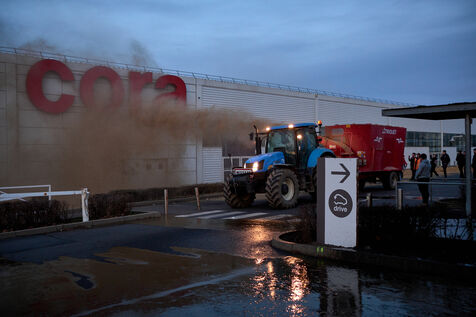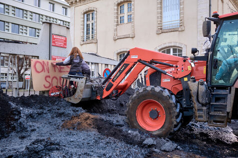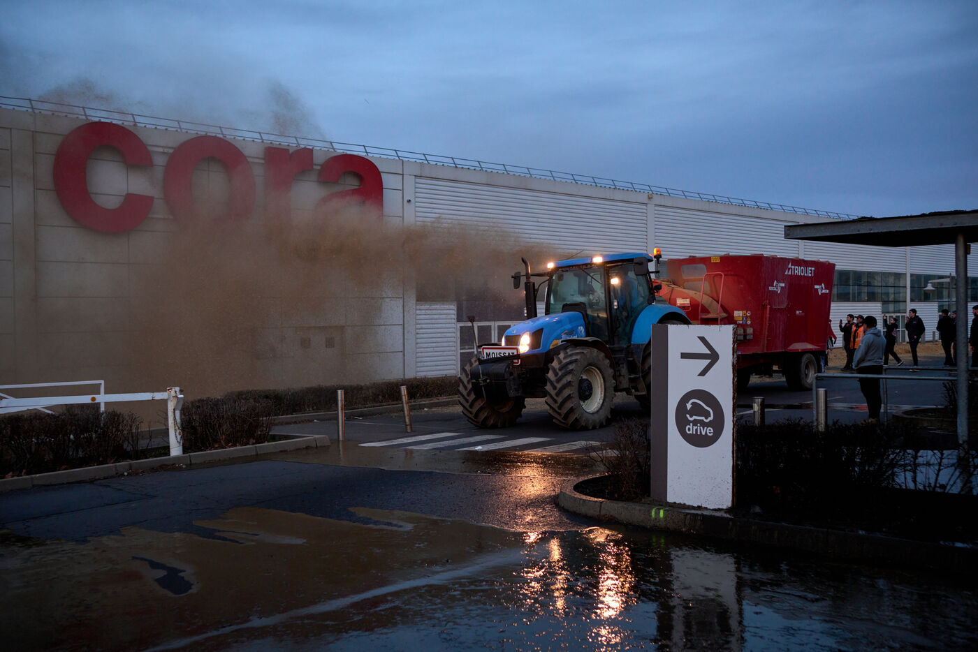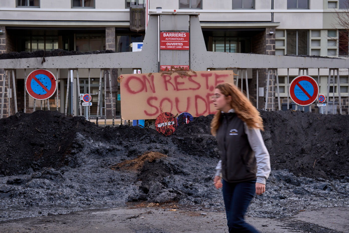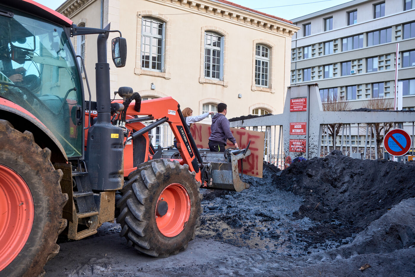 Targeted actions by farmers continue in Clermont Ferrand: welding the entrance gate to the Direction departementale des territoires, dumping skips of ash and spraying the facade of a supermarket with slurry and straw.
