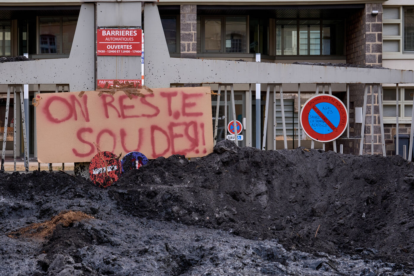 Les actions ciblees des agriculteurs continuent a Clermont Ferrand: soudure du portail d entree de la direction departementale des territoires, deversement de bennes de cendres et facade de grande surface aspergée de lisier et de paille.