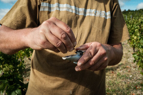 C’est au cours de la matinée ensoleillée du 02 Septembre 2025 que Stéphane Bonjean fait le tour des ces vignes. Localisées sur la zone AOC vin de Châteauguay, le vigneron auvergnat circule dans ses vignes pour en contrôler l’état. Après les phases caniculaires, une période de pluie intense a permis au raisin de se gorger suffisamment d’eau avant la récolte. Après un contrôle visuel des grappes, un examen de la concentration d’alcool est fait grâce au réfractomètre pour alcool.