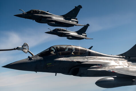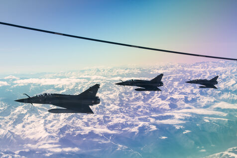 Refueling in flight during the Orion23 exercise, Istres Air Base 125. Two-seater Rafale and Mirage 2000 fighters from the French Air Force and Space Ministry flew for three hours around this imposing A330 MRTT for an extreme technicality refueling exercise.