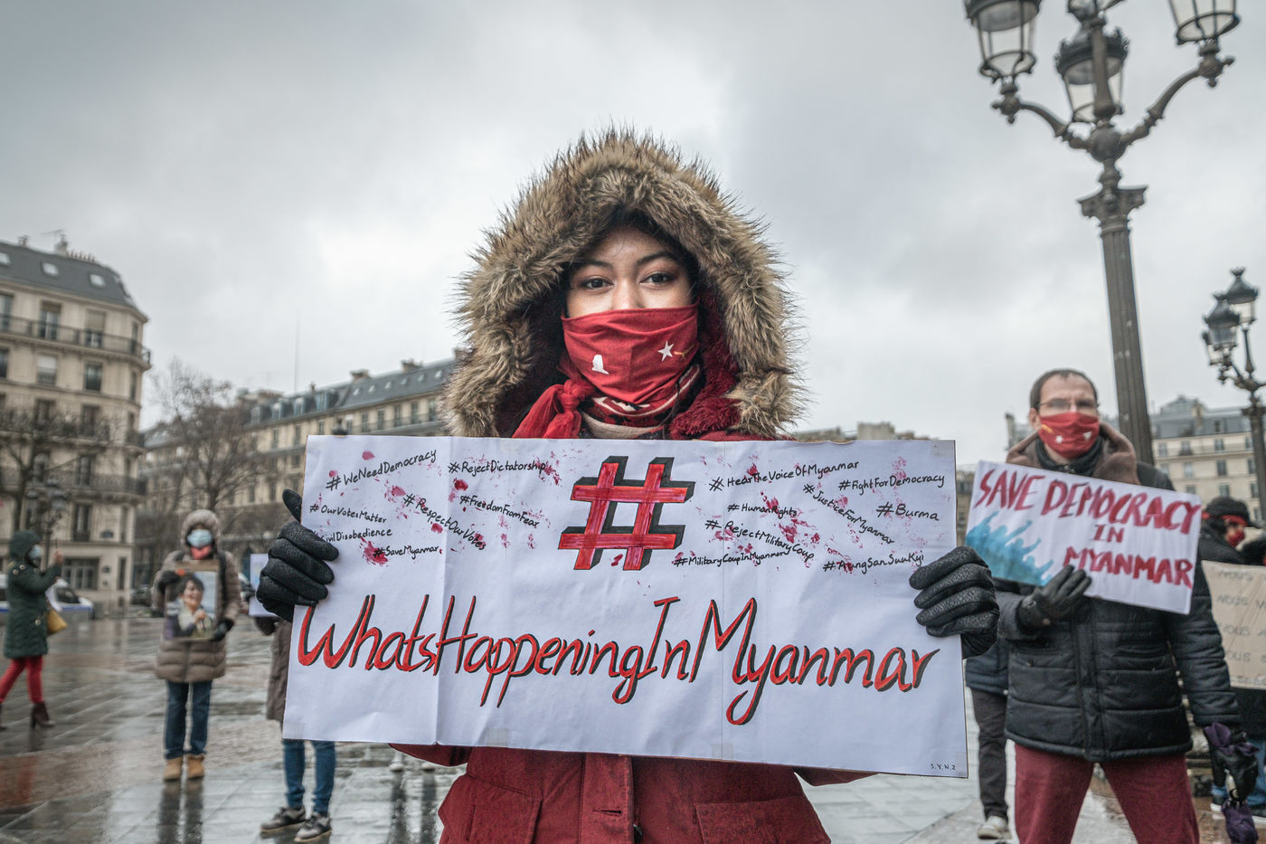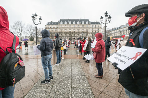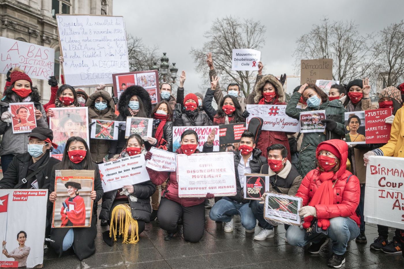 Au plus fort des manifestations au Myanmar, le Dimanche 07 Janvier, ils étaient quelques dizaines de Birmans de France à se rassembler à Paris devant l'hotel de ville pour montrer leur opposition aux coup d'état perpétré par les militaires et les arrestations de membres du gouvernement, leur soutien au parti d'Aung Sang Suu Kyi la LND, ou simplement pour montrer leur solidarité avec le peuple Birman.