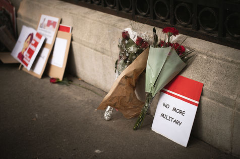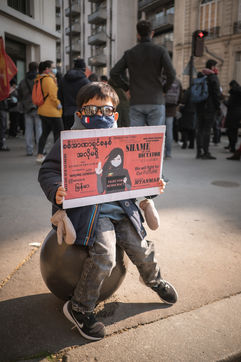 Rassemblement de la communauté Birmane de France à Paris, en oppoistion au coup d'état en Birmanie par la junte militaire. L'ambassadeur du Myanmar rejoint une délégation pour une dépose d'une gerbes de fleurs à l'embassade en hommage aux victimes abatues.
