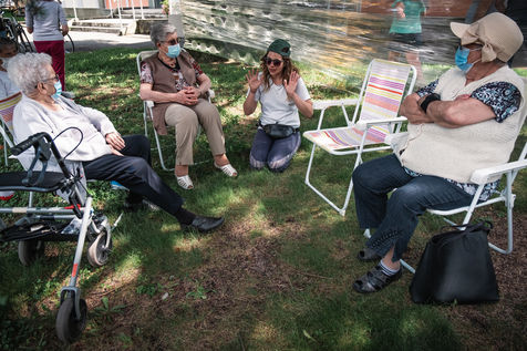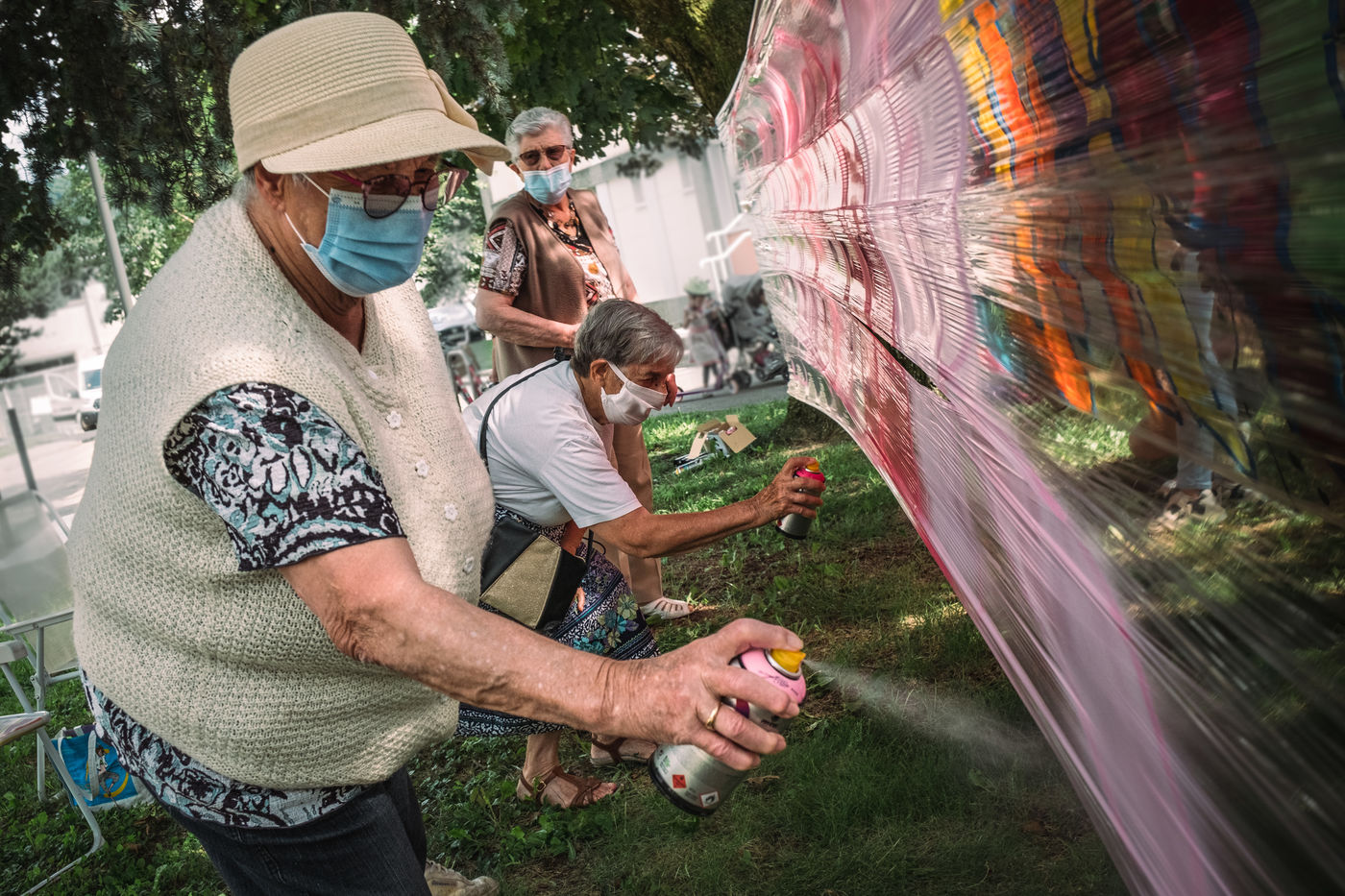 Dans le cadre du Street Art Fest à Grenoble, des personnes agées et des enfants participent à un atelier de découverte du graffiti animé par deux membres d'un collectif de Street Art Grenoblois.